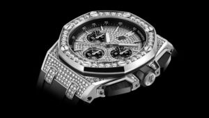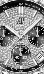 このモデルは、18Kホワイトゴールドのケースにブリリアントカットダイヤモンドが施され、ブラックラバーのストラップと組み合わせることで、スポーティさとエレガンスを兼ね備えています。ダイヤモンドの総カラット数は約5.8カラットに達し、腕元での存在感は抜群です。ムーブメントには、フライバッククロノグラフ機能を備えた自動巻きキャリバー4401を搭載し、約70時間のパワーリザーブを誇ります。日常生活での防水性能は20mと、実用性も兼ね備えています。