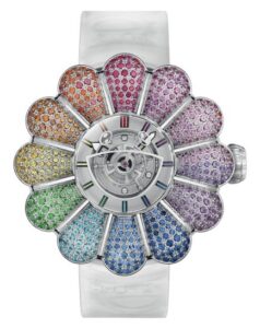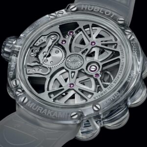 MP-15 タカシムラカミ トゥールビヨン サファイア レインボーは、現代美術家・村上隆氏とのコラボレーションによって生まれたモデルです。 ウブロ初のセンターフライングトゥールビヨンを採用し、時計の中央に配置されたトゥールビヨンが、村上氏のシンボルである「お花」モチーフを立体表現しています 。