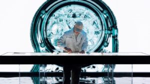 ケースサイズは54.1×41.5mmで、素材にはチタニウムを採用。流線形のデザインと透明なサファイアクリスタルが組み合わさり、未来的な外観を持ちます。また、文字盤を廃したモノクロ時刻表示や、斜めに配置されたトゥールビヨンの構成が特徴的で、機能美と視認性を両立させています。