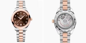 2025年6月、オメガは初の30mm機械式レディースモデル12機種を一斉に発表しました。これまでは28mmがクォーツであったのに対し、34mm以上に搭載されていた機械式ムーブメントを小径ケースに初導入した意義あるシリーズです。素材バリエーションはステンレス、ツートーン(セドナ/ムーンシャイン)、そしてソリッドゴールドなど多彩で、Ref. 220.20.30.20.63.001はその中で唯一ブラウンダイヤル+ダイヤインデックスのセドナコンビ仕様です