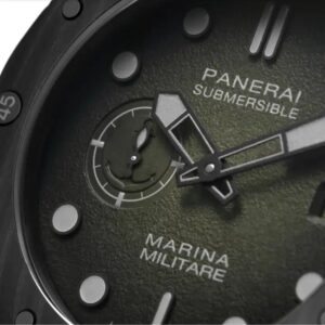 このモデルで最も特徴的なのが、ケースに採用された「Carbotech™」。炭素繊維と高性能ポリマーPEEKを高圧で圧縮成型したこの素材は、軽量でありながら耐衝撃性・耐腐食性に優れ、海軍用途に理想的。しかも、素材の積層構造により、一つとして同じ模様が存在しない“唯一無二”の外観が生まれます。マットな質感は高級感と実用性を両立させ、他にはない存在感を放ちます。