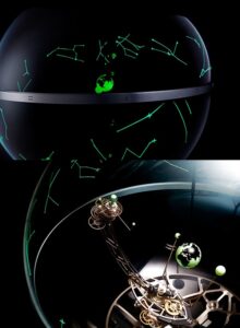 ガラス球内の惑星がそれぞれ連動し、惑星の実際の軌道運動をリアルタイムで再現ができる圧巻の存在感