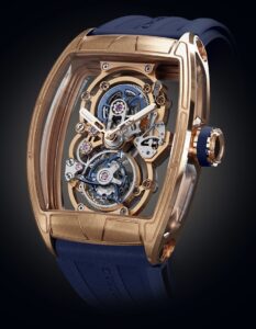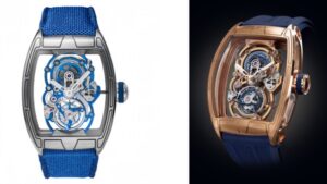 また、スケルトン構造により内部機構がダイヤル側から見渡せるようになっており、まるで芸術作品のような美しさを持ちます。ケースのデザインには、クストスが長年培ってきた「チャレンジケース」特有のスポーティかつモダンなフォルムが反映され、機械美と造形美が高度に融合した逸品です。