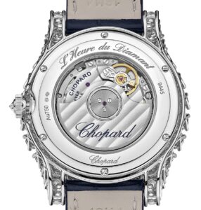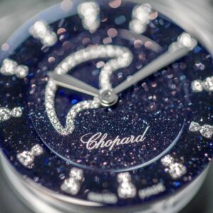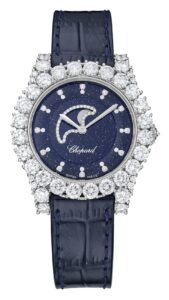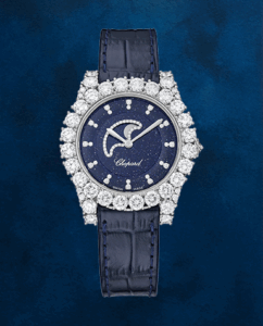 ショパールにとって宝飾時計の頂点とも言える“L’Heure du Diamant”コレクションに、新たに加わったムーンフェイズ付きモデル。自動巻きのCHOPARD 09.02‑Cキャリバーに、ムーンフェイズ機能を搭載し、ロマンティックな美しさと機能性を両立しています。文字盤は夜空をイメージしたアベンチュリンガラス。星が瞬くような美しさをダイヤモンドの輝きとともに味わえます。