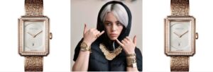 彼女は18Kベージュゴールド製でダイヤモンドが施された、シャネルの「ボーイフレンド ツイード」28mmモデルを着用している姿が目撃されていますシャネルらしいツイードモチーフと、程よいサイズ感の28mmケースが、ビリーの中性的かつエレガントな美学に合致しています。