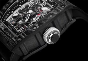 • RM003‑V2:カーボンナノファイバーの積層構造が時計全体に未来感と立体感を与える。
