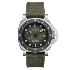 Ref. PAM01697のボディは44mm径のブラッシュ仕上げステンレススティール製。回転式ダイバーズベゼルにはマットグリーンのセラミックインサートが組み込まれ、視認性と耐久性を両立しています。裏蓋にはアビアツィオーネ・ナヴァーレの翼エンブレムが刻印され、ミリタリーの伝統を具現化。300mの防水性能も装備されています。