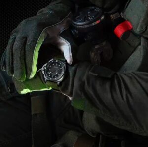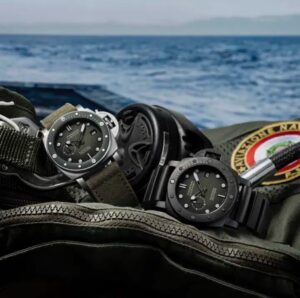 特に、グリーンからブラックへのグラデ文字盤は、航空用ヘルメットや機材の色調を模倣することで、視覚的な深みを演出。海軍と航空部隊の連携を想起させる重厚感が漂います。