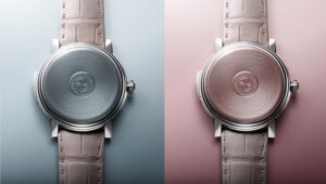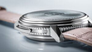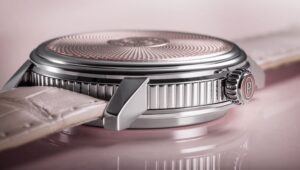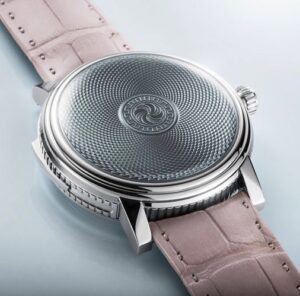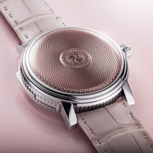 「ドーン・ローズ」は、柔らかなピンクのエナメルダイヤルが特徴で、夜明けの優しい光を表現しています。ギヨシェ彫りのパターンは、松ぼっくりの螺旋をモチーフにしており、自然の美しさと調和を象徴しています。このデザインは、優雅さと温かみを感じさせる仕上がりとなっています。