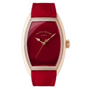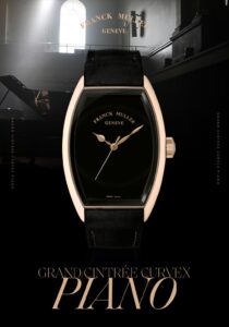 「グランド カーベックス ピアノ」シリーズは、フランク ミュラーの象徴的なトノウ型ケースをさらに進化させた「グランド カーベックス」ケースを採用しています。サファイアクリスタルガラスを広く取り、立体的な曲線美を強調。文字盤にはインデックスを排し、20層以上のエナメルを重ねたピアノブラックエナメルを使用することで、深みのある光沢を実現しています。また、インナーベゼルをゴールドやカラーモデルにすることで、文字盤の広がりと優雅さを演出しています。