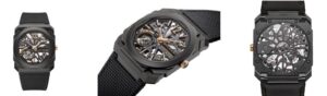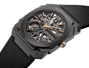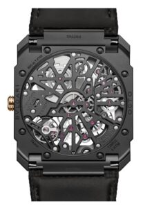 ブラックDLCチタン製のケースは、軽量かつ耐久性に優れ、日常使用にも適した素材です。八角形のオクトデザインは建築的要素を感じさせ、ブルガリらしい個性を放っています。ダイヤルはスケルトン仕様で、内部構造が視覚的に楽しめる一方、ローズゴールドの針とインデックスによって高い視認性も確保。9時位置にスモールセコンド、7時〜8時方向にパワーリザーブ表示を配置することで、実用性も考慮されたデザインとなっています。