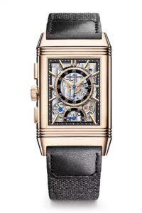 Ref.Q389257Jは、18Kピンクゴールド製のケースを採用し、表面にはシンプルな時分表示、裏面にはスケルトン仕様のクロノグラフムーブメントが配置されています。手巻きムーブメントを搭載し、約52時間のパワーリザーブを備えています。