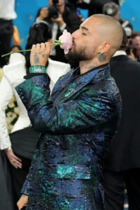 マルーマは、メキシコ系アメリカ人デザイナー、ウィリー・チャバリアがデザインしたミッドナイトブルーとエメラルドグリーンのブロケードスーツを着用しました。このスーツは、1940年代のパチューコ文化にインスパイアされており、ラテン系とブラックのアイデンティティとレジリエンスを称えるものでした。コロンビア出身のマルーマが、母国の国石であるエメラルドをあしらった時計を選んだことは、彼の文化的背景と誇りを表現する強いメッセージとなりました。
