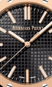• ダイアル:ブラックの「Grande Tapisserie」模様、ピンクゴールドのアプライドインデックスとロイヤルオーク針(ルミノバ付き)