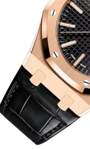 • ストラップ:ブラックのアリゲーター(型押しクロコダイル)ストラップ+ピンクゴールド製APフォールディングクラスプ