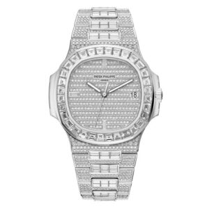 ノーチラス 5719/10G‑010 は、18Kホワイトゴールドをベースに全体に1,343個以上のブリリアント&バゲットカットのダイヤモンドを敷き詰めた、究極のデコレーションモデルです。直径40mm/厚さ約8.7mm、Cal.324 S C 自動巻きムーブメント 搭載、約45時間のパワーリザーブ。耐水性能は30~120mで、日常使用にも耐えうる構造で、パテック フィリップが年間ごく少量しか製造しない超希少モデルです。