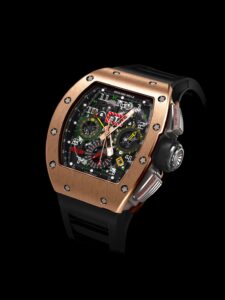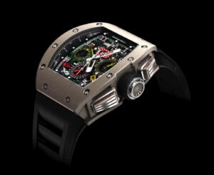 RM11-02は、リシャール・ミルの象徴的なトノー型ケースを採用し、スポーティでありながらエレガントなデザインが特徴です。ケース素材には、チタンやカーボンTPT®などの先進的な素材が使用されており、軽量性と耐久性を兼ね備えています。また、レーシングカーのペダルからインスピレーションを得たプッシュボタンのデザインも、このモデルの魅力の一つです。