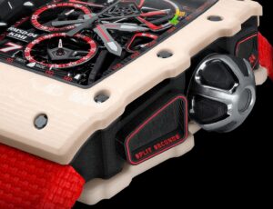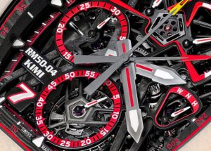 RM50-04は、F1ドライバーのキミ・ライコネンとのコラボレーションモデルで、彼の所属するアルファロメオ・レーシングチームのカラーリングを反映したデザインが特徴です。ケースには、ホワイトクオーツTPT®とカーボンTPT®が使用され、軽量性と耐衝撃性を実現しています。赤いアクセントカラーが、スポーティな印象を強調しています。
