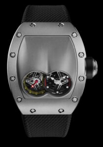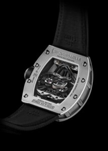 2012年に発表されたRM 053は、ポロ競技の激しい衝撃から動きを保護するため、独特のデザインが採用されました。 ケースはチタン製で、2つの独立したダイヤルが特徴的です。 この設計により、プレイヤーの手首にフィットし、視認性と耐衝撃性を両立しています。 トゥールビヨン機構を搭載した限定15本の希少なモデルです