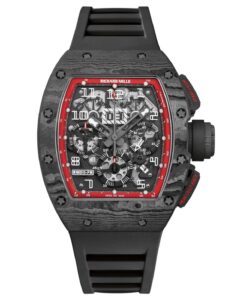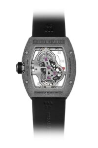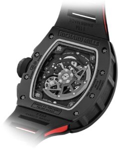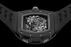 ケース素材にはカーボンTPT®やチタンが使用され、極限までの軽量化と高い耐久性を追求します。 さらに、内部のトゥールビヨン機構は、重力の影響を極力抑え、高精度な時間計測を可能にします。 スケルトン構造のムーブメントは、わずか9.5gという軽量設計で、リル・シャール・ミルの技術力の結晶といえます。