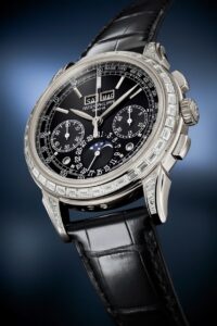 パテック・フィリップ 5271P‑010は、ブランドの伝統と技術力が結集された、手巻きクロノグラフ+永久カレンダーの最高峰です。プラチナ製ケースと5カラット超のバゲットダイヤモンドが、技術美を華やかに引き立てます。