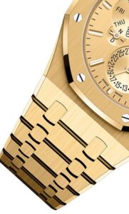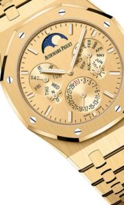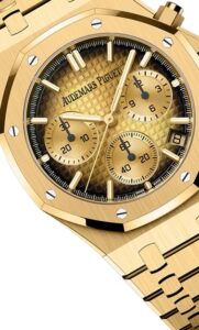 一方、「26240BA.OO.1320BA.02」は、自動巻きクロノグラフを備えたモデルで、こちらも41mm径の18Kイエローゴールドケースを採用しています。厚さは12.4 mmあり、よりスポーティなサイズ感です。
