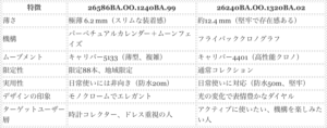 26586BAは、極薄かつ複雑機構と限定性が融合した、まさに芸術作品とも言えるモデルです。一方、26240BAは堅牢な構造と高機能クロノグラフ、日常的な使いやすさが両立されており、用途に応じて選び分けられる2モデルです。