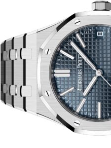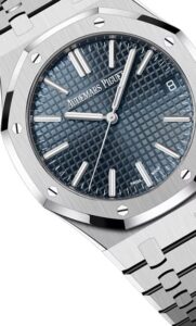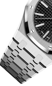 オクタゴナルベゼル、磨きとヘアライン仕上げのステンレススティールブレス、APフォールディングクラスプ、ホワイトゴールド製のアプライドインデックスとルミナス仕上げの針は共通仕様。視認性にも優れ、夜間でも正確な時間の把握が可能です
