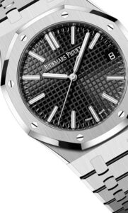 一方、“15510ST.OO.1320ST.07”は、同じく41mmステンレススティールケースを採用し、“Grande Tapisserie”黒文字盤を備えたモデル。マットなブラックダイヤルがスタイリッシュかつモダンな雰囲気を演出します