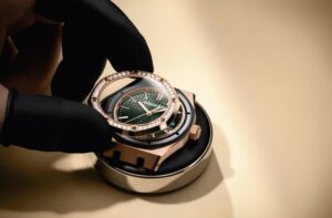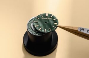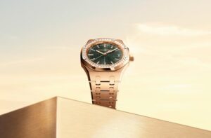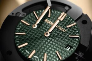 「15551OR.ZZ.1356OR.06」は、18Kローズゴールドをケースとブレスレットに使用し、ベゼルにブリリアントカットのダイヤモンドを配した豪華なモデルです。カーキグリーンの「Grande Tapisserie」模様を施したダイヤルが、ウォームトーンのゴールドと相まって、個性的でありながらエレガントな存在感を放ちます 。