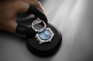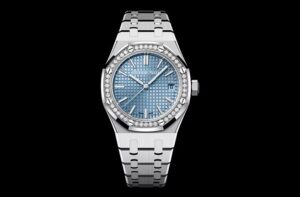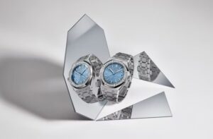 「15551ST.ZZ.1356ST.04」はステンレススチールケース&ブレスレットに、ライトブルーの「Grande Tapisserie」ダイヤルとダイヤモンドセッティングのベゼルを組み合わせたモデルです。氷のように澄んだブルーとステンレスのクールな輝きが、魅力的なコントラストを生み出しています 。