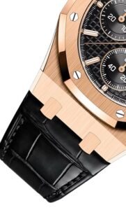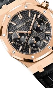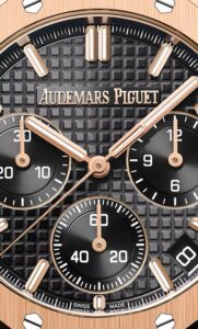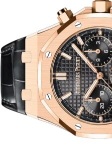 このモデルは、41mmの18Kローズゴールドケースに、ブラックの「グラン・タピスリー」模様のダイヤルを搭載しています。文字盤には、クロノグラフ用のサブダイヤルが配置され、視認性と機能性を両立。ブラックのアリゲーターストラップと18Kローズゴールド製のAPフォールディングクラスプが、全体の高級感を引き立てています。