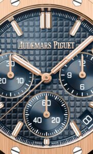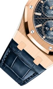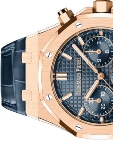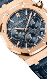こちらのモデルも41mmの18Kローズゴールドケースを採用していますが、ダイヤルカラーが「ブルー・ヌイ・ヌアージュ50」と呼ばれる深い青色に変更されています。サブダイヤルの色もブルーで統一され、全体的に落ち着いた印象を与えます。ブルーのアリゲーターストラップと18Kローズゴールド製のAPフォールディングクラスプが組み合わさり、洗練されたデザインが特徴です。