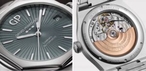 搭載ムーブメントは自社製Cal. GP01800。54時間のパワーリザーブと高振動(28,800vph)を両立しつつ、美しい仕上げを施されたムーブメントはシースルーバック越しに堪能できます。191部品で構成され、ローターにはピンクゴールドが使用されるなど、細部までこだわりが光ります。