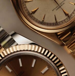 「ロレゾール(Rolesor)」は、ロレックス(Rolex)とフランス語で金を意味する「オール(Or)」を組み合わせた言葉です。ロレックスの特許技術として1933年に登録され、ステンレススチールとゴールド(金)のコンビネーションを指します。ケースとブレスレットにステンレススチールを使用し、ベゼルやリューズ、ブレスレットの中央リンク部分にゴールドを組み合わせることで、エレガントで華やかな印象を与えます。