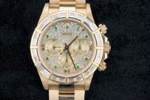 Ref.16568BRは、ロレックス デイトナの中でも特に高級感を強調したモデルで、1990年代後半から2000年代初期にかけて製造されていました。ケースサイズは40mm、素材は18Kイエローゴールド。ベゼルには贅沢にバゲットカットのダイヤモンドが24個セッティングされ、視覚的なインパクトが強い仕様です。