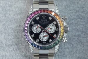 「116599RBOW」は、ロレックスのデイトナシリーズの中でも特に華やかなモデルとして知られています。その最大の特徴は、ベゼルに配置された36個のレインボーカラーのサファイアで、見る角度によって異なる輝きを放ちます。ケースとブレスレットには18Kホワイトゴールドが使用され、ダイヤルには8つのダイヤモンドインデックスが配置されています。ムーブメントには、ロレックス自社製のCal.4130が搭載されており、高い精度と信頼性を誇ります。このモデルは、2012年頃に登場し、限定的な生産数とその美しさから、現在でも高い人気を維持しています。