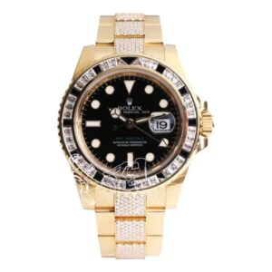 116748SANRもまた、GMTマスターIIシリーズの中で特別な存在です。ケースとブレスレットには18Kイエローゴールドが使用されており、ベゼルにはブラックサファイアとダイヤモンドがセッティングされています。このブラックサファイアのベゼルは、シックで落ち着いた印象を与え、ビジネスシーンでも違和感なく着用できます。文字盤はブラックで、インデックスにはダイヤモンドがあしらわれており、高級感と視認性を兼ね備えています。