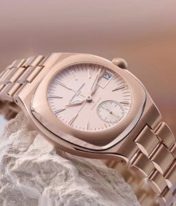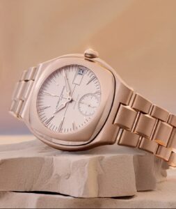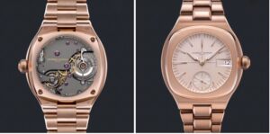 本作のケースとブレスレットは18K 5Nレッドゴールド製で、直径41.5mm、厚さ12.7mmというケースサイズながら、エレガントな一体型3リンク構造によって装着感も重さも計算された設計です。文字盤はクリームカラーのオパライン仕上げによりシルバーピンクのニュアンスがあり、各インデックスとアセガイ針には18Kゴールドを使用し、ホワイトのスーパールミノバが塗布され視認性も確保されています。ケースやブレスレットの仕上げは、ポリッシュとサテンブラシ加工を組み合わせたハイレベルな職人技です。