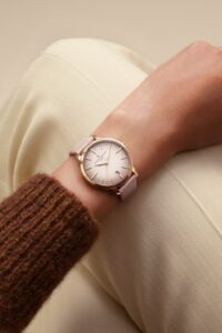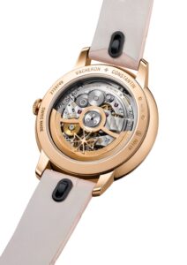 このPatrimonyの魅力は、1950年代のクラシックな円形モデルを現代的に再解釈したデザイン。ドーム型グラデーション文字盤とドロップ型ミニッツマーカー、サファイアクリスタル(表裏)などにより、光の陰影によりフェミニンで奥行きのある表情を演出しています。