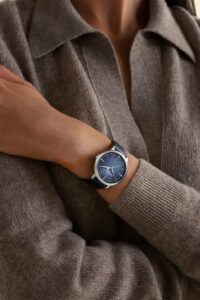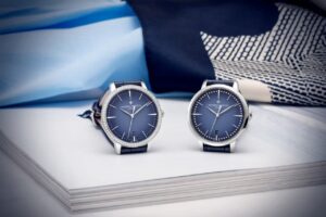 対となるホワイトゴールドモデルは、深いブルーのグラデーション文字盤を採用。クールで凛とした印象を与える一方、48石のダイヤモンドがアクセントとなり、品格ある華やかさを醸し出します。