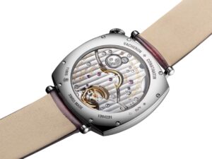 手巻き式で、制御機構に工夫が施されており、約48時間の連続駆動が可能。精密で信頼性の高い駆動を楽しめます。裏面には美しい装飾が施され、丁寧な作りが見て取れます。