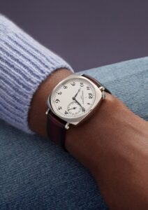 1921年にアメリカ向けに作られたモデルを復刻。ダイヤルが斜めに配置され、1時30分位置にリューズがあるアシンメトリーなデザインが特徴です。ケース径36.5 mm、厚み約7.4 mmのホワイトゴールド製。落ち着いた銀色の文字盤にアラビア数字が並び、クラシックながら存在感があります。