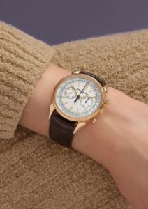 1955年に発表されたモデルを再解釈。通称「牛の角」ラグを採用し、ケース径は38.5 mm、厚さ10.9 mmのピンクゴールド製です。文字盤にはローマ数字と青い目盛りが組み合わさり、上品かつクラシックな印象を与えます。