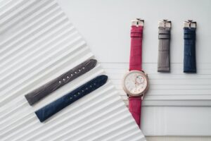 ストラップ:濃紺・ピンク・ブラウンの三色ミシシッピアリゲーター、ピンクゴールド製アーディヨンバックル付き(交換可)。