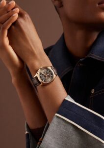 高精度な完全カレンダームーブメント。日付・曜日・月表示とともに、ムーンフェイズも搭載。122年に1日しか誤差が出ない精密設計が魅力。装飾も非常に美しく、熟練職人による手仕上げが随所に光ります。パワーリザーブは約40時間で、こちらもシースルーバック仕様です。