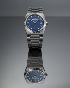 このモデルはステンレススティール製で、青ダイヤルが特徴です。統合ブレスレットやフルーテッドベゼルなど、オリジナルの特徴をしっかり継承。自動巻き(パワーリザーブ 40時間)、37mmケース、5気圧防水など、実用性も高い設計です
