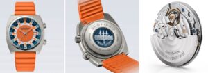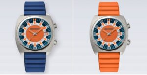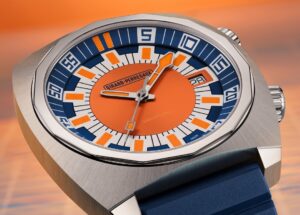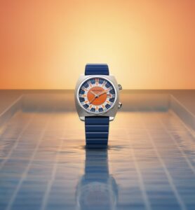本作のケース素材には軽量かつ高強度なグレード5チタンを採用。サイズは40.3 mm × 38 mmと、コンパクトで着用感にも優れる設計です。14角形のベゼルと、ケースからベゼルにかけて施されたヘアライン仕上げは、1969年オリジナルモデルへのオマージュ。加えて、インナーベゼルを操作するための2時位置リューズ、オレンジとブルーの鮮やかな“ブルズアイ”ダイヤルが、機能性と視認性、そして遊び心を絶妙に両立させています。