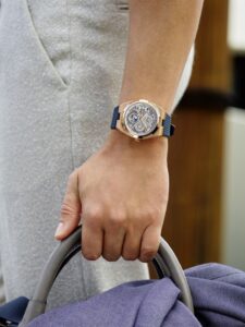 両モデルとも、18Kピンクゴールド製ブレスレット、ダークブルーのグレインドカーフスキン(レザー)、そしてダークブルーのラバーストラップという3種類が付属し、工具不要で簡単に付け替え可能な「インターチェンジャブル」システムを採用しています 。ムーブメントの精緻な仕上げは表側とサファイアケースバックの両面から堪能できます。