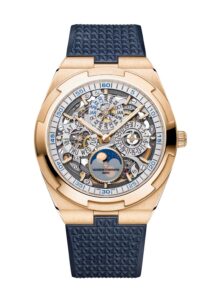 ダイアルとカウンターはブルートーンが基調で、ムーンフェイズにはブルーのベロア風ミニッツトラックを採用。視覚的に落ち着いた印象を与えます。